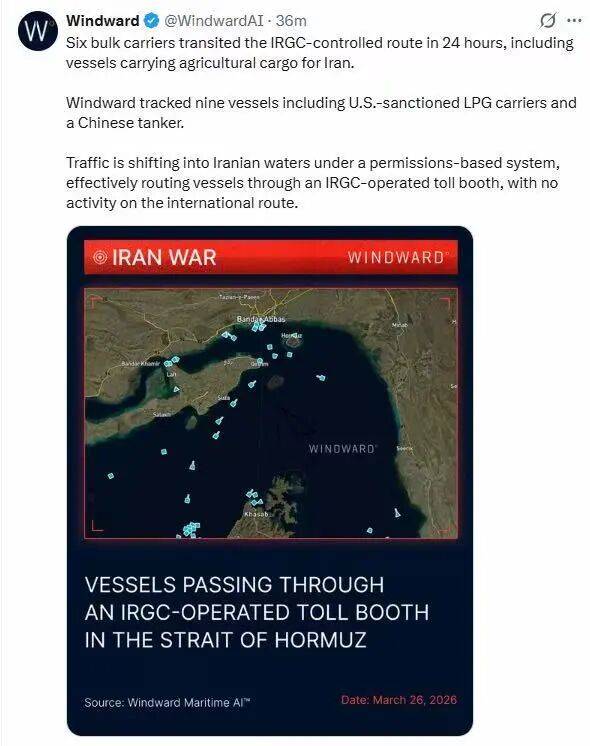 目前霍尔木兹海峡的实际状况是,国际常规航道已基本停摆。据WindwardAI的数据图和视频分析指出,国际交通被迫偏移并转移到伊朗领水内,受伊朗革命卫队(IRGC)的“许可制”系统控制。这些过往船只实际上必须通过一个由IRGC运营的“收费站”,单次过路费据估算高达约200万美元。在这一模式下,Windward还报告了有6艘运载粮食等农业货物的散货船顺利驶入伊朗。