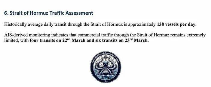 此外,根据标普(S&P)3月19日至25日的对比数据表显示,霍尔木兹海峡的货船和油轮日通行量极低,大多数日子仅为0到4艘,远低于曼德海峡(BAM)的通行量。这一数据进一步证实了该区域航运仍处于“极度危险”和近乎停滞的状态。