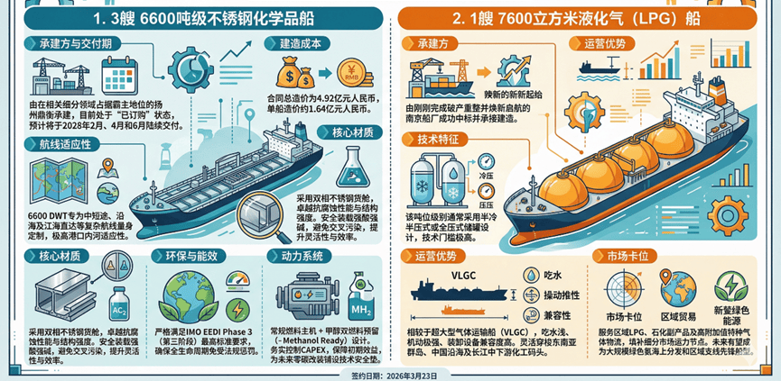 本次订单的具体结构为3艘6600吨级不锈钢化学品船和1艘7600立方米液化气(LPG)船。这些船舶代表了当前中小型液货船市场的最前沿水平,深刻折射出航运业的脱碳演进策略。