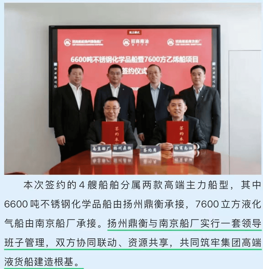 2026年3月23日,招商局船舶工业集团旗下的扬州鼎衡与南京船厂,同招商局南京油运股份有限公司(招商南油)正式签署了2型共计4艘高端液货船的建造合同。此次签约精准锚定了当前的两款高端主力船型。在执行层面,扬州鼎衡与南京船厂在此次合作中首次实行了“一套领导班子管理”的创新融合模式。