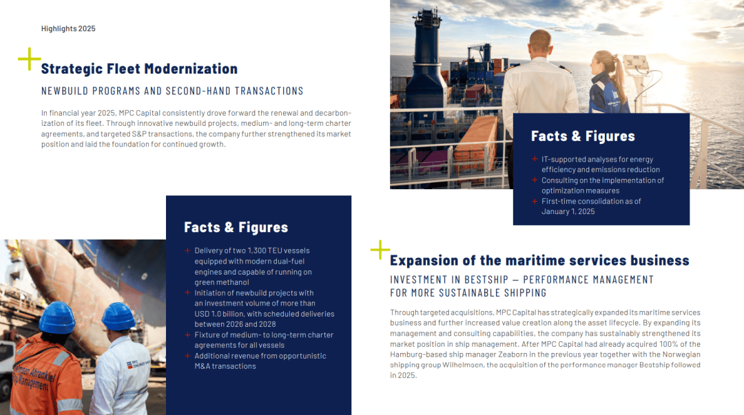 公司年报披露,在此前整合 Zeaborn 的基础上,MPC Capital 于2025年进一步收购了 Bestship。后者的功能并不只是传统管理,而是提供基于 IT 的船舶能效和减排分析,以及优化措施实施咨询。公司称,这为其海事服务能力增加了新的维度。