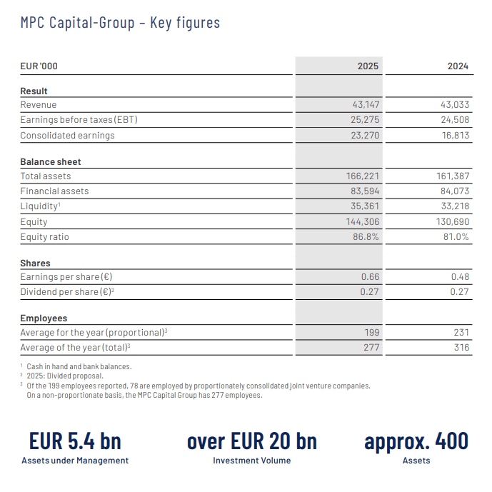 如果只看财务数据,MPC Capital 2025年实现营业收入4314.7万欧元,同比基本持平;税前利润升至2527.5万欧元,高于上年的2450.8万欧元;管理资产规模升至54亿欧元。