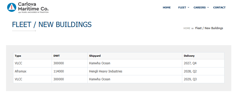 根据 Carlova Maritime 官网最新披露的信息,该公司目前在建新船共三艘,其中包括 两艘30万载重吨VLCC,船厂均为 Hanwha Ocean(韩华海洋),交付时间分别为 2027年第四季度和 2029年第三季度。这意味着,Carlova 已正式将其 VLCC 订单簿扩大至两艘。