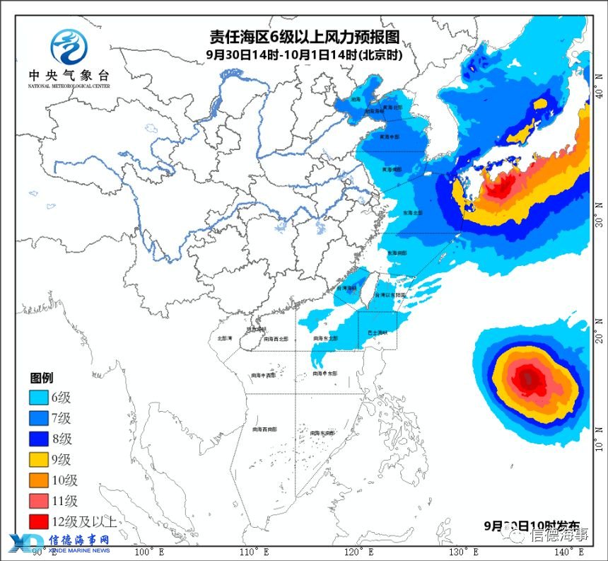 大风预报:9月30日14时到10月1日14时,东海中东部将有7-9级大风,阵风10-11级;日本九州岛、四国岛和本州岛及其附近海域的风力可达10-12级,“潭美”中心经过的附近海域或地区风力有13-14级,阵风15-16级。