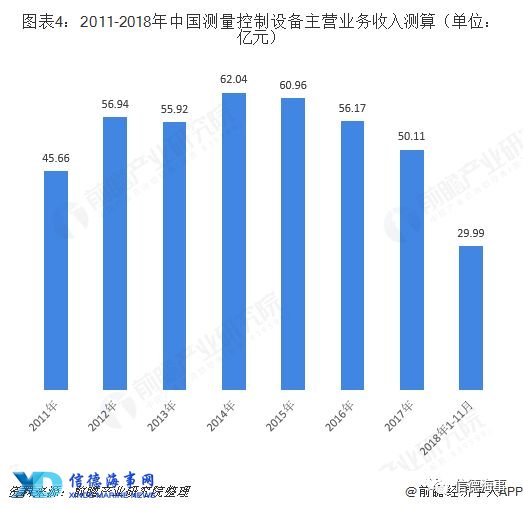相比通信导航设备,测量控制设备所占比重更大,但同样受制于较低的本土化率,市场规模也较为有限。根据调研数据显示,在我国船舶电子行业中,测量控制设备营业收入占比约40%,即2017年,我国船舶测量控制设备营业收入约50.11亿元;2018年1-11月,船舶测量控制设备营业收入为29.99亿元。