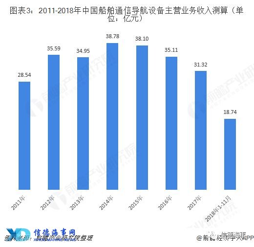 那么,可以计算得出,2017年,我国船舶通信导航设备营业收入约31.32亿元;2018年1-11月,船舶通信导航设备营业收入为18.74亿元。