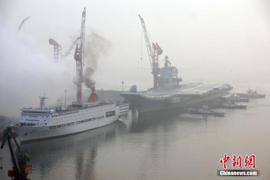图为2018年5月18日山东舰完成首次出海试验任务,返抵大连造船厂码头。 侯融 胡锴冰 记者 陈国全 图片来源:中国军网