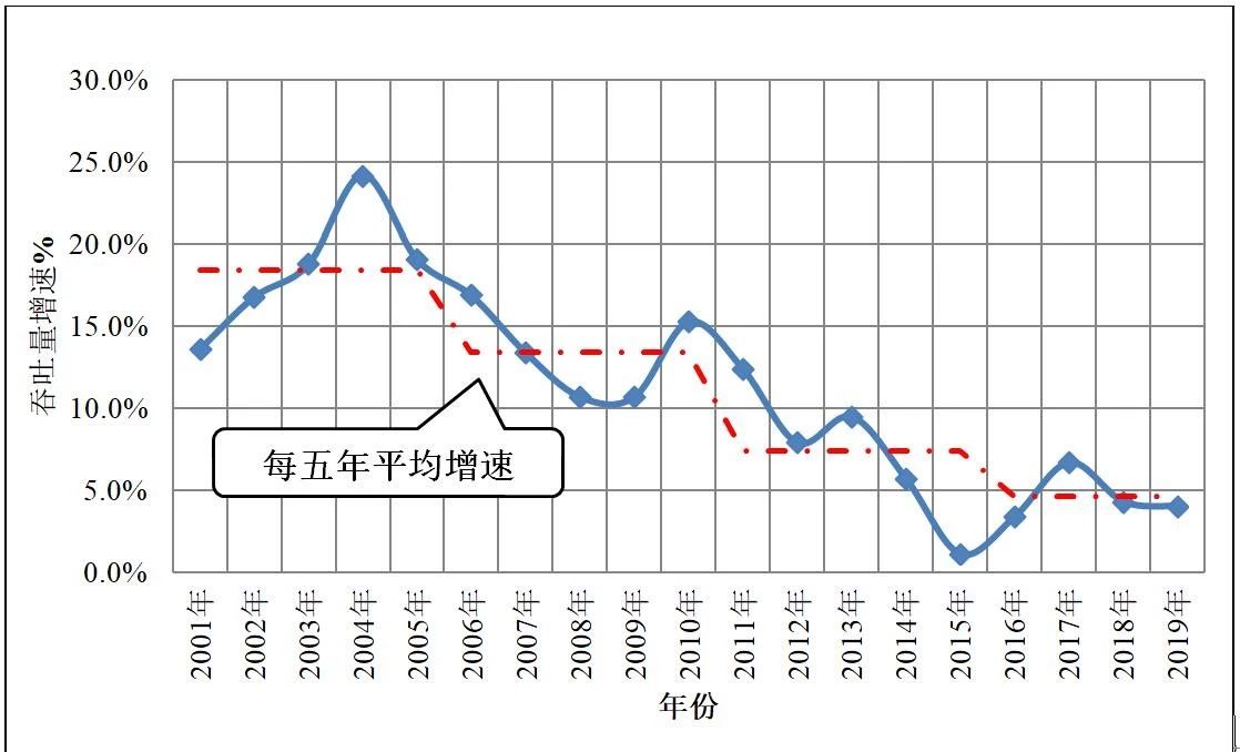 2019年沿海港口吞吐量预计将达到91.7亿t,同比增长4.0%(外贸增长4.8%、内贸增长3.2%),基本实现原预期增长(如图5所示),较2018年放缓0.3个百分点,下半年在煤炭、矿石、原油等大宗货类进口增长的带动下,全年走势前低后高。从历史趋势分析,沿海港口吞吐量增速增长逐步下台行,“十五”、“十一五”、“十二五”沿海港口平均增速分别为18.5%、13.5%和7.5%,“十三五”前四年降至4.5%(如图6所示)。随着沿海港口低速增长成为常态,转型升级、建设世界一流港口将成为港口实现高质量发展重要标志。