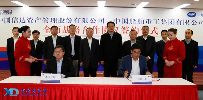 1月16日,中船重工与中国信达全面战略合作协议签字仪式在北京举行,中船重工董事长胡问鸣、中国信达总裁陈孝周出席仪式并致辞,中船重工副总经理姜仁锋、中国信达总裁助理陈延庆代表双方在协议书上签字。