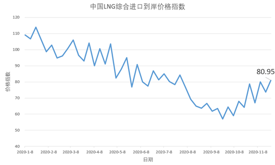 SHPGX导读:11月25日,海关总署全球贸易监测分析中心和上海石油天然气交易中心联合发布的中国LNG综合进口到岸价格指数显示,11月16日-22日,中国LNG综合进口到岸价格指数为80.95(CIF,不含税费、加工费),较前一周上涨9.73%,与去年同期相比下降32.5%。