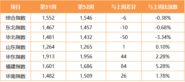 山东指数报收1265点,环比上升1点,增幅0.1%,华东指数报收1956点,环比上升44点,增幅2.28%,福建指数报收1686点,环比上升84点,增幅5.28%。