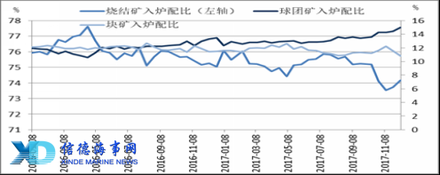 在供给侧改革实行之后,铁矿石市场结构也发生了微妙的变化,港口存量持续上升给了钢厂更充分的采购余地,矿山迎合市场需要竞争高品资源的供给,买方的市场地位明显提升。一季度北方各地均处于采暖季环保限产的执行期,叠加各地级市在重污染天气均执行了阶段性停限产措施,直接限制了北方钢厂烧结矿和高炉的开工和生产。整个采暖季全国高炉开工率始终压制在65%以下的低位,唐山地区的开工率一度降至50%以下。在产量受限的情况下,进入采暖季的初期,钢厂厂内库存明显被动累积,直接限制了后期钢厂冬储采购的释放,而采暖季临近结束时,吨钢利润又出现明显回落,因此钢厂采购意愿持续较差,基本以按需采购、压低厂库水平为主。从入炉配比的角度分析,由于烧结机的开工大幅受限,钢厂明显调整了原料高炉入炉配比的结构,烧结矿比例由76%降至70%左右,而球团矿配比的增加较为明显。这也变相限制了多数粉矿的用量。
