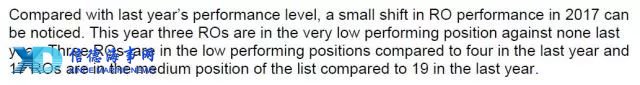 与去年的绩效水平相比,可以注意到RO绩效有较小的变化。今年3家RO的绩效为非常低,而去年则为无。3家RO的绩效为低,去年为4家。17家RO的绩效为中,去年为19家。