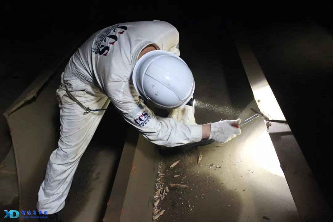 初见验船师张林,他正在4万吨散货船的压载舱里做营运检验。夏季闷热的压载舱内,散发出阵阵酸臭的味道,他左手举着手电照亮压载舱的一角,右手拿着铁锤敲击着铁锈。“敲击铁锈是为了检查舱内腐蚀程度,同时还要检查舱体变形情况、焊缝密性。”张林对笔者解释道。这样的压载舱有二十几个,验船师要用小锤一个个角落敲击检查,走遍一艘船,涉及的船级和法定检验项目有500个,测厚点数量约1.4万个。“走过路过不能错过。”张林说,“工作量再大,也不能放松对安全质量的把控,不能放过每一个细节。”这是验船师对船舶安全的承诺。