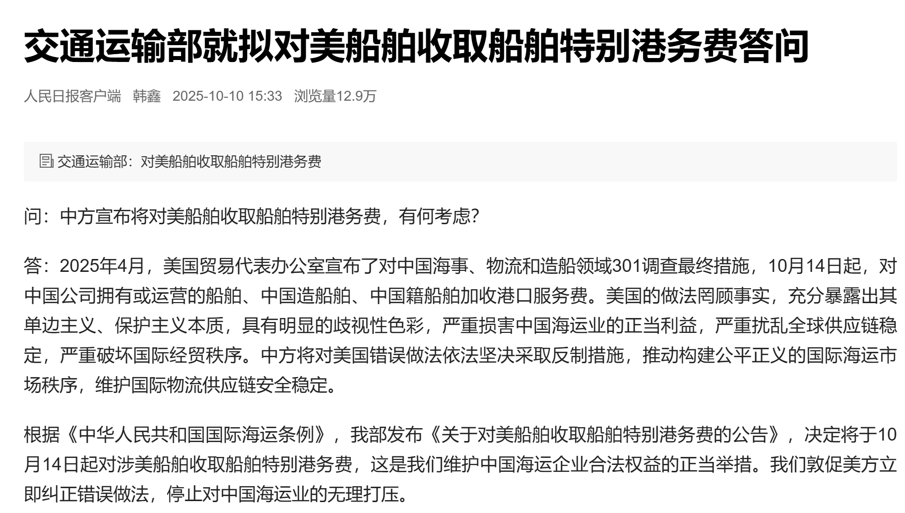 答:2025年4月,美国贸易代表办公室宣布了对中国海事、物流和造船领域301调查最终措施,10月14日起,对中国公司拥有或运营的船舶、中国造船舶、中国籍船舶加收港口服务费。美国的做法罔顾事实,充分暴露出其单边主义、保护主义本质,具有明显的歧视性色彩,严重损害中国海运业的正当利益,严重扰乱全球供应链稳定,严重破坏国际经贸秩序。中方将对美国错误做法依法坚决采取反制措施,推动构建公平正义的国际海运市场秩序,维护国际物流供应链安全稳定。