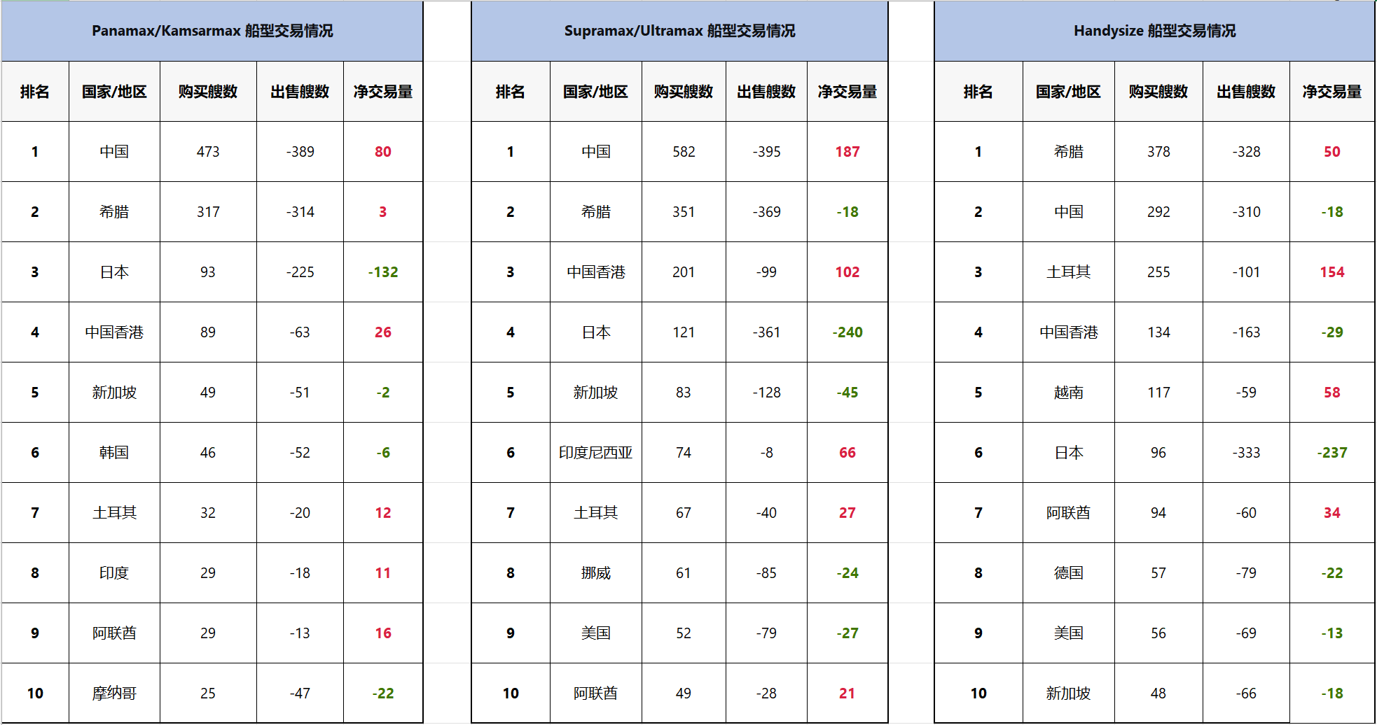 数据显示,中国在二手干散货市场中占据绝对买方主导地位,而希腊、日本等传统航运国家、以及新兴市场土耳其、印度尼西亚、印度、阿联酋则在买卖之间展现出不同的战略意图。