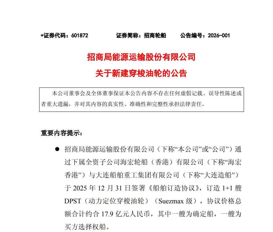 而根据招商轮船最新发布的公告,该公司对穿梭油轮(DPST)领域的布局,已从此前披露的董事会审议层面,推进至正式签约落地。公司最新公告显示,其下属全资子公司海宏轮船(香港)有限公司已与大连船舶重工集团有限公司(大连造船)于2025年12月31日签署《船舶订造协议》,订造1+1艘Suezmax级动力定位穿梭油轮(DPST)(一艘确定船、一艘选择权船),两艘船协议总价约17.9亿元人民币。