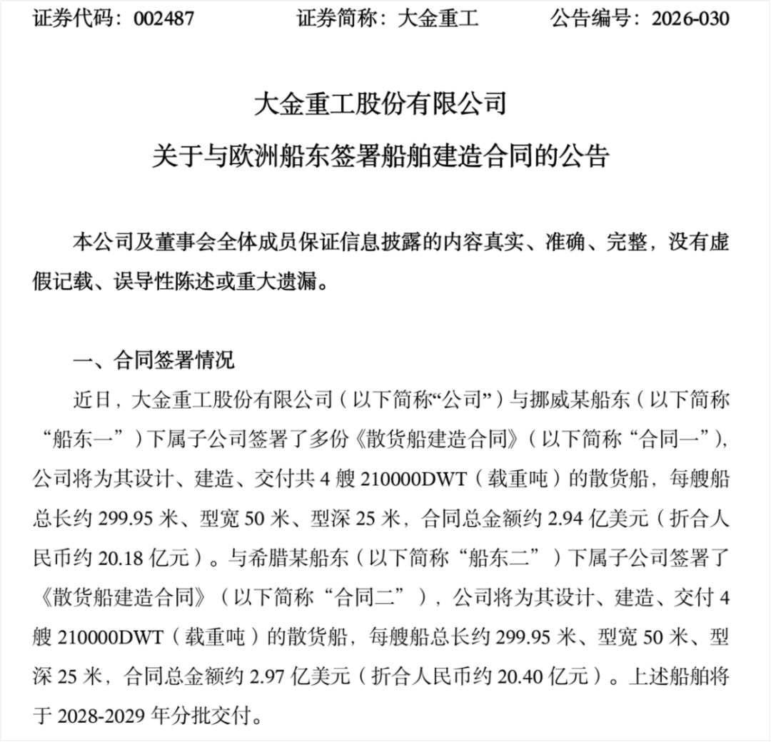 2026年4月23日,大金重工宣布与挪威Seatankers Management下属子公司及希腊Danaos下属子公司分别签署了《散货船建造合同》。大金重工将分别为这两家船东建造各4艘、共计8艘210000载重吨的纽卡斯尔型散货船。该批船舶总长约299.95米,型宽50米,型深25米。船舶设计符合最新排放要求,并配备了脱硝装置和混合式脱硫塔。