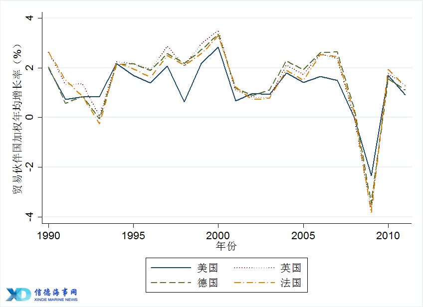 图2比较了1980-2011年间美、英、德、法四国各自的贸易伙伴加权平均增长率,并且按照发展中国家和发达国家对贸易伙伴国构成进行了划分。可以看出,在美国的贸易伙伴国中,发达国家贸易伙伴的增长率略低于其它三国所对应的增长率,但发展中国家贸易伙伴的增长率明显高于其它三国所对应的增长率,并且,美国的增长率和其发展中国家贸易伙伴的增长速度之间的差距随时间越来越明显。[2]
