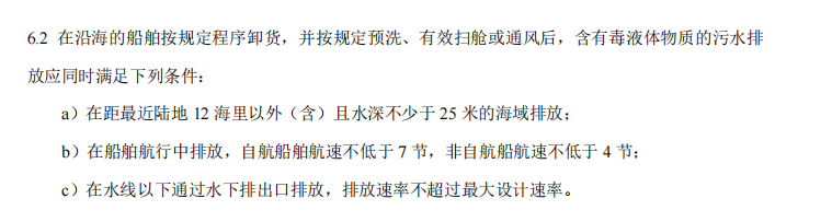 根据《船舶水污染排放控制标准》(GB3552-2018)第六条,含有毒液体物质的污水排放控制要求如下: