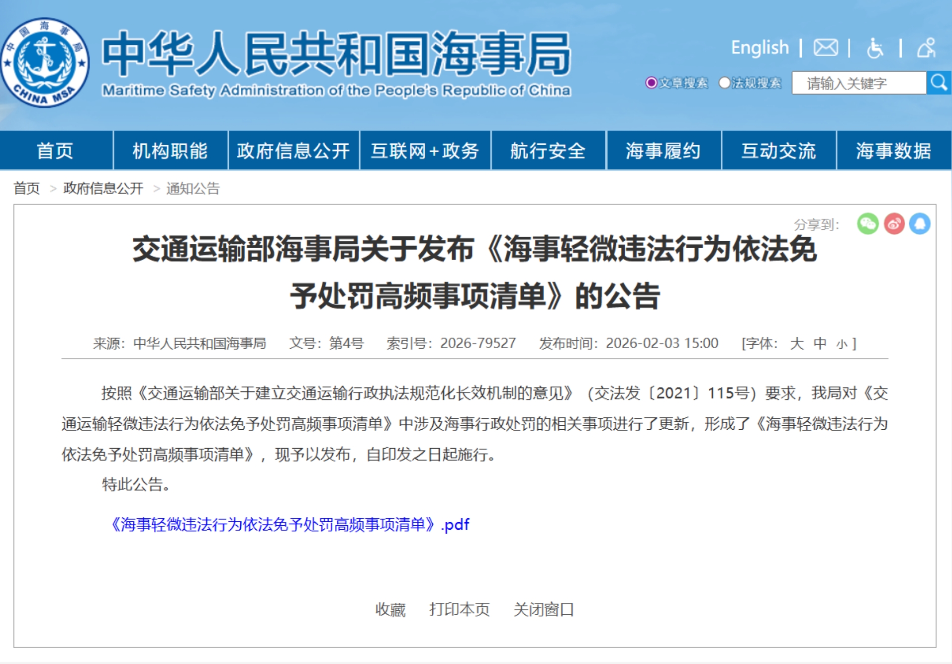 按照《交通运输部关于建立交通运输行政执法规范化长效机制的意见》(交法发〔2021〕115号)要求,我局对《交通运输轻微违法行为依法免予处罚高频事项清单》中涉及海事行政处罚的相关事项进行了更新,形成了《海事轻微违法行为依法免予处罚高频事项清单》,现予以发布,自印发之日起施行。