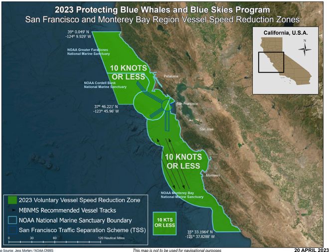 2023年保护蓝鲸和蓝天计划南加州地区船只航速区,提前告知租家或者船东船舶要求加入自愿减速计划,以免后期引起不必要的误解或者麻烦,(Please be advised that we will comply with the 2023 'Blue Whales and Blue Skies Program Southern California Region Vessel speed reduction zone' unless otherwise instructed).