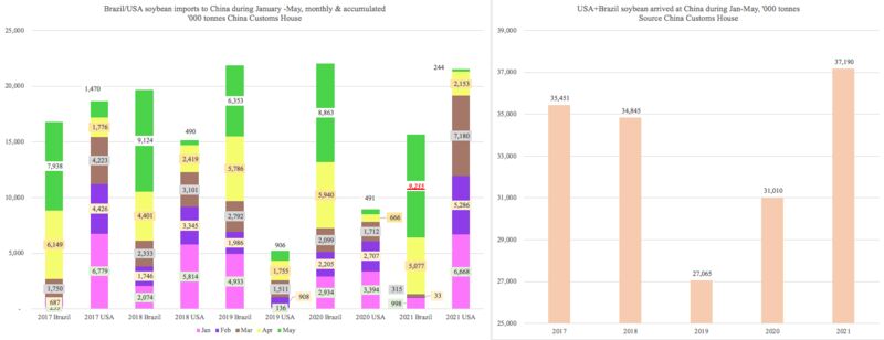 A record high 9.235 million tonnes of Brazilian soybean arrived at Chinese ports in May amidst booming dry bulk shipping market. The previous record month was June 2020, which saw 10.512 million tonnes discharged. The delayed crop due to rain in Brazil indicates a slower start in Q1 and a much stronger export season in Q2. As per ANEC, Brazil loaded 15.674 and 14.221 million tonnes of soybean in April and May (SECEX's aggressive estimates were 17.380 and 16.4 million tonnes for April and May), of which 74 percent are destined for China. China needs to prepare more silos for the incoming beans.