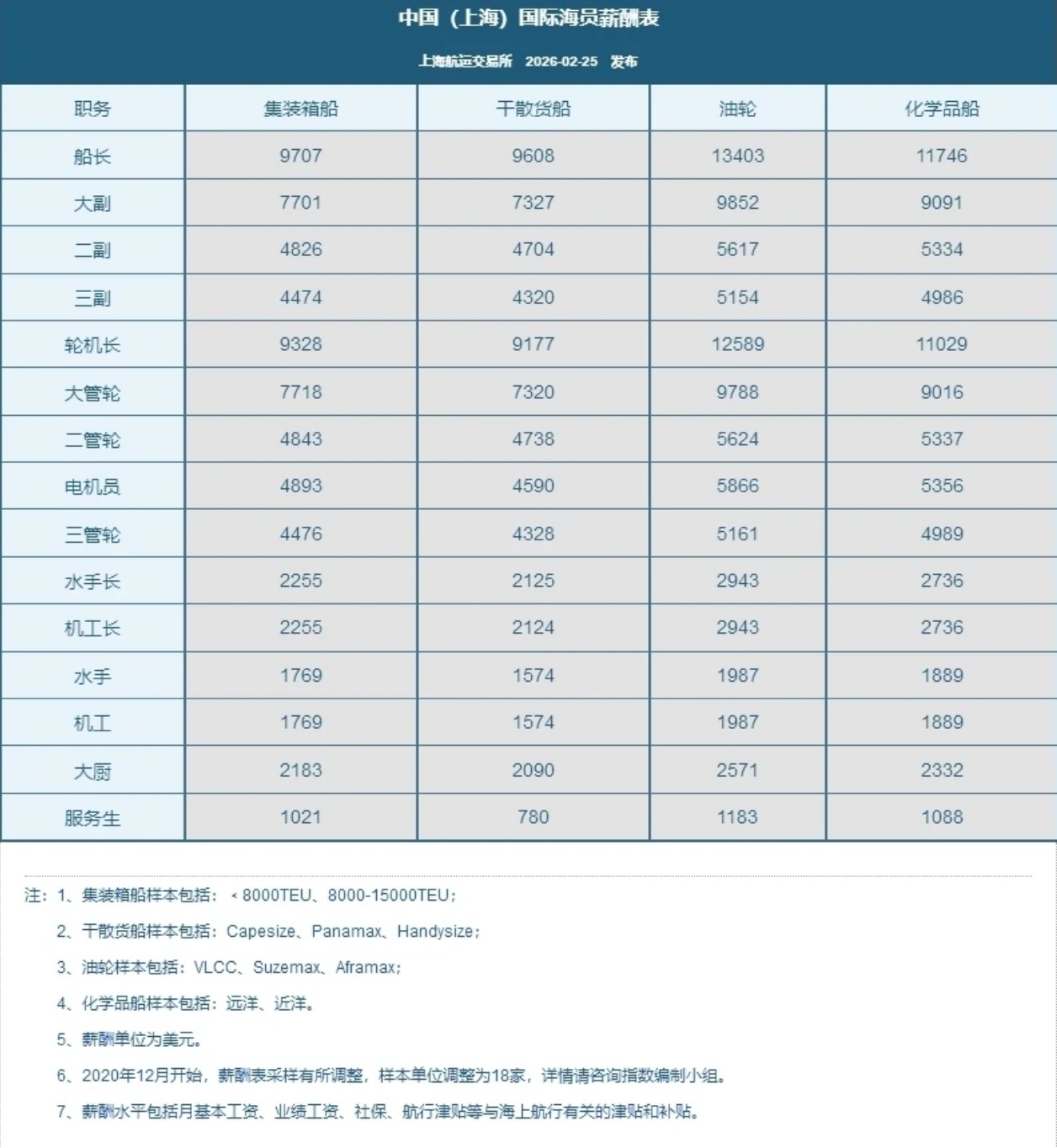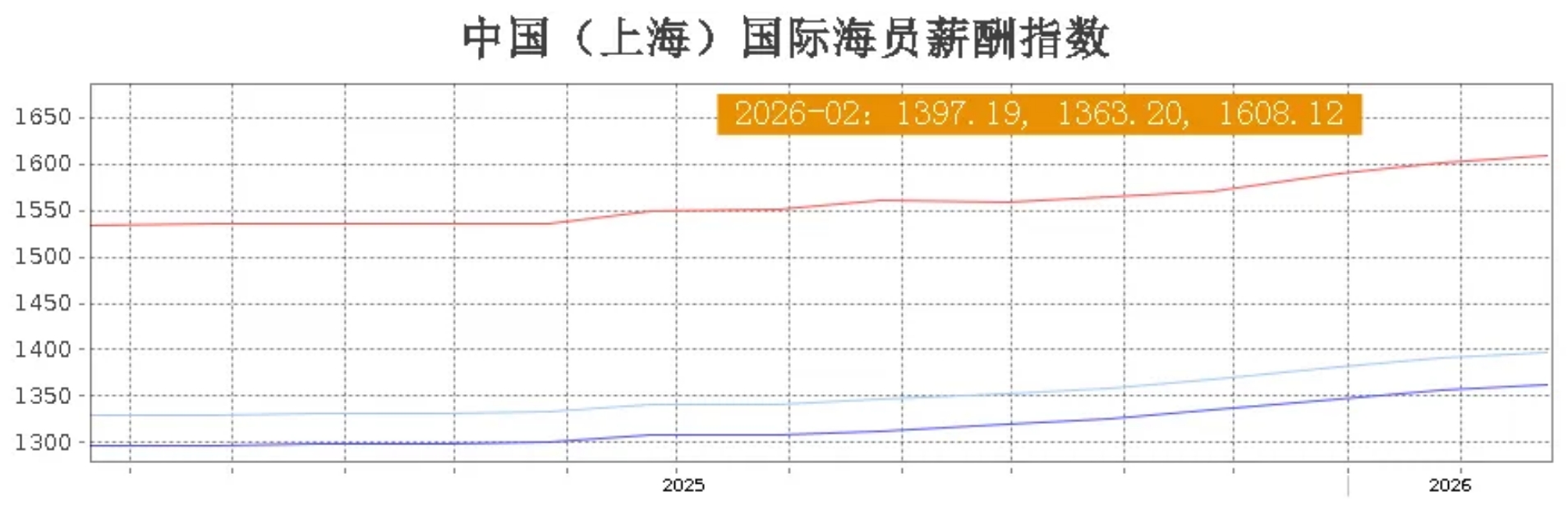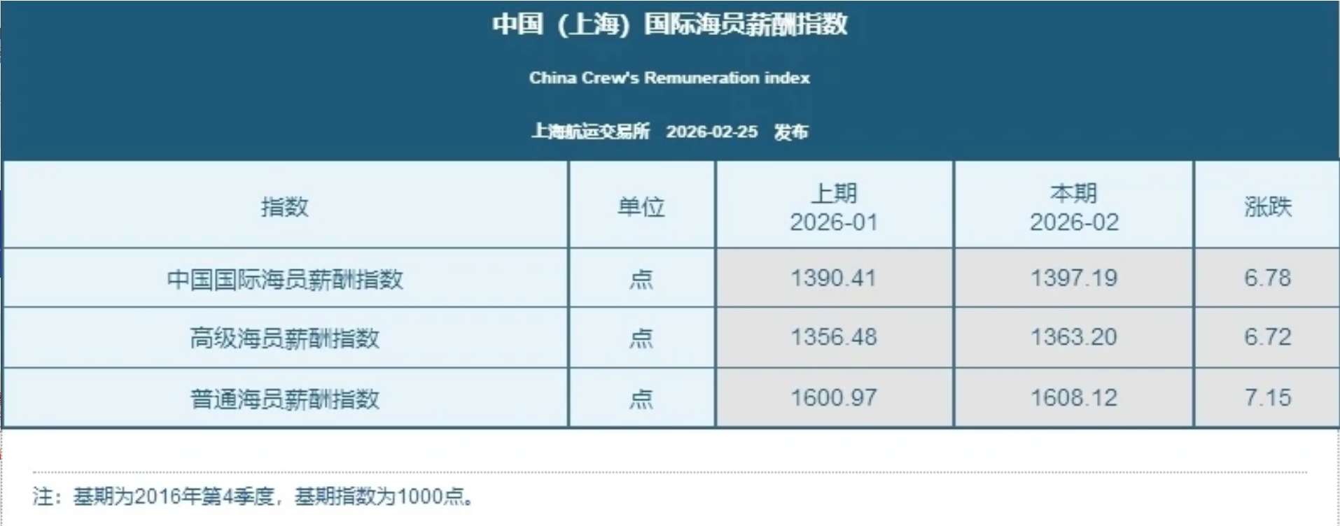 2026年2月25日,上海航运交易所发布的中国(上海)国际海员薪酬指数报收1397.19点,较上期上涨6.78点。本期高级海员薪酬指数报收1363.20点,较上期上涨6.72点;普通海员薪酬指数报收1608.12点,较上期上涨7.15点。