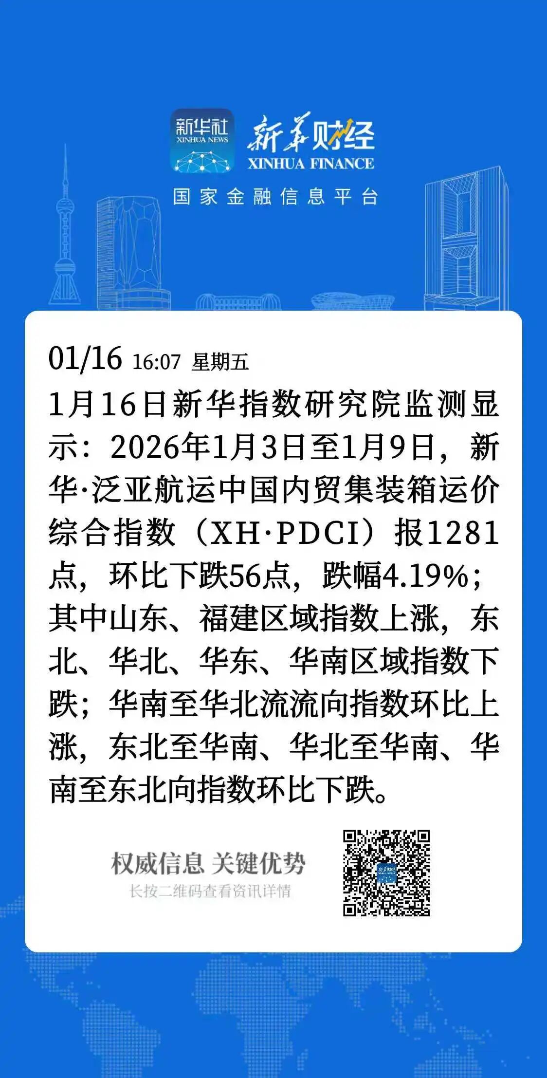 环比下跌56点,新华·泛亚航运中国内贸集装箱运价指数