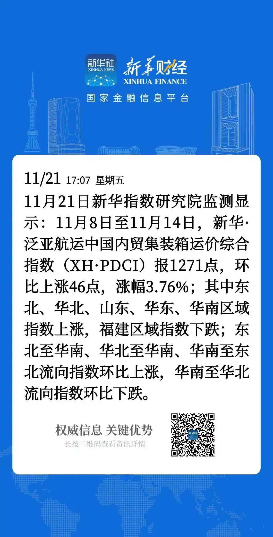 新华·泛亚航运中国内贸集装箱运价指数周报(XH·PDCI)2025.11.21