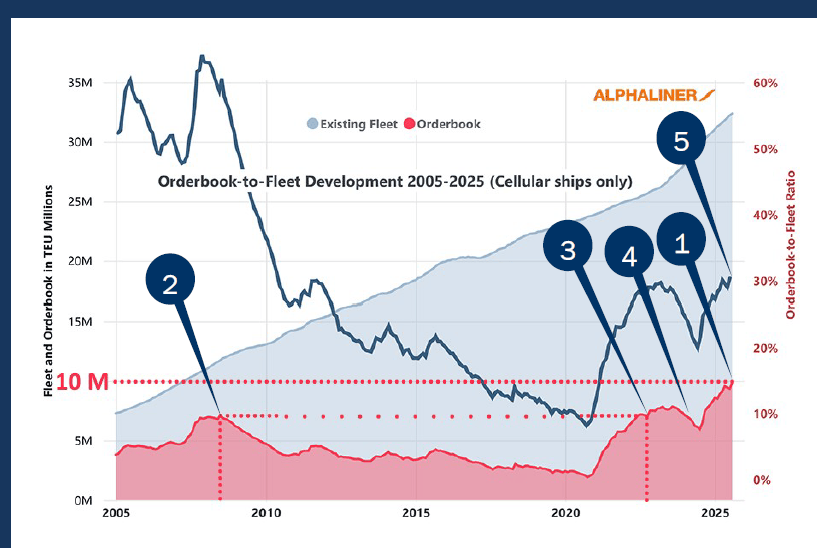全球航运业正见证一个前所未有的时刻。根据Alphaliner最新统计,全球在建集装箱船订单簿已达 995万TEU,正逼近 1,000万TEU的关口。这是全球航运史上的第一次。与之相比,2008年市场高峰期的历史纪录仅为 712万TEU。换句话说,今天的订单簿不仅远超昔日高点,而且在时间跨度上也被大幅拉长,部分新船甚至排期至 2030年之后。