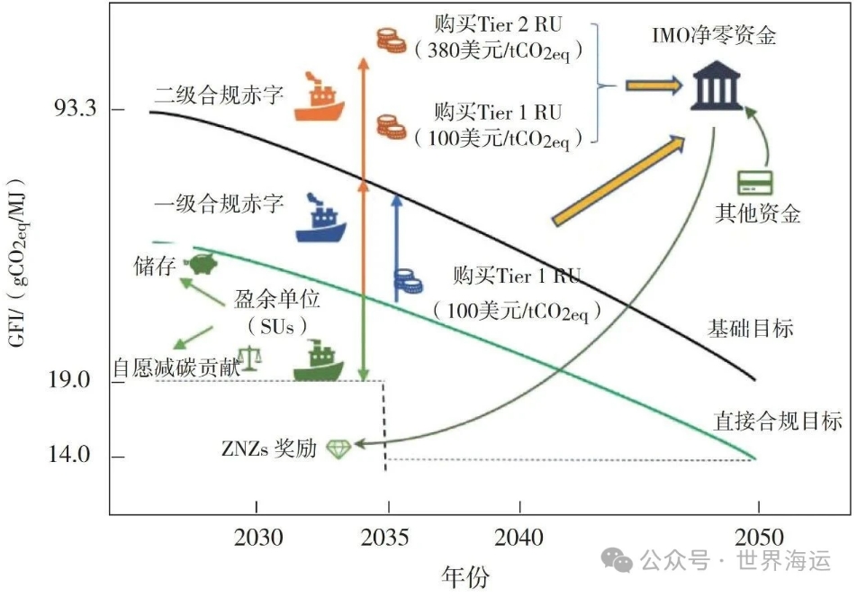 ZNZs ( Zero or Near-Zero GHG Emis-sion Technologies,Fuels,and/or Energy Sources ),指零或近零温室气体排放技术、燃料和能源来源。净零框架规定船舶满足ZNZs获得奖励的条件是其年度GFI不高于特定阈值:2034年12月31日前为19 gCO2eq/MJ,2035年起为14 gCO2eq/MJ。具体奖励方法和ZNZs的认定标准将在2027年3月1日前决定。