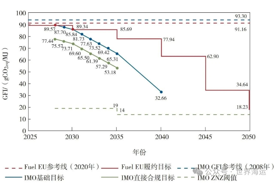( 2 ) 净零框架与Fuel EU都是基于船舶年度GFI来设定履约基线的,但是计算公式、参数选择、基准值都有所不同,各年的合规基础目标也不一样,如图2所示,从中可看出净零框架的履约标准严于Fuel EU。