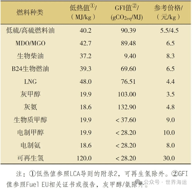 净零框架实施后,航运公司燃料选项增多,测算总成本时需要权衡多种因素包括燃料的市场价格、消耗量 ( 与热值相关 )、合规成本或盈余 ( 与GFI相关 ) 等综合考量。常见燃料的低热值、GFI值和国内市场参考价格见表2。
