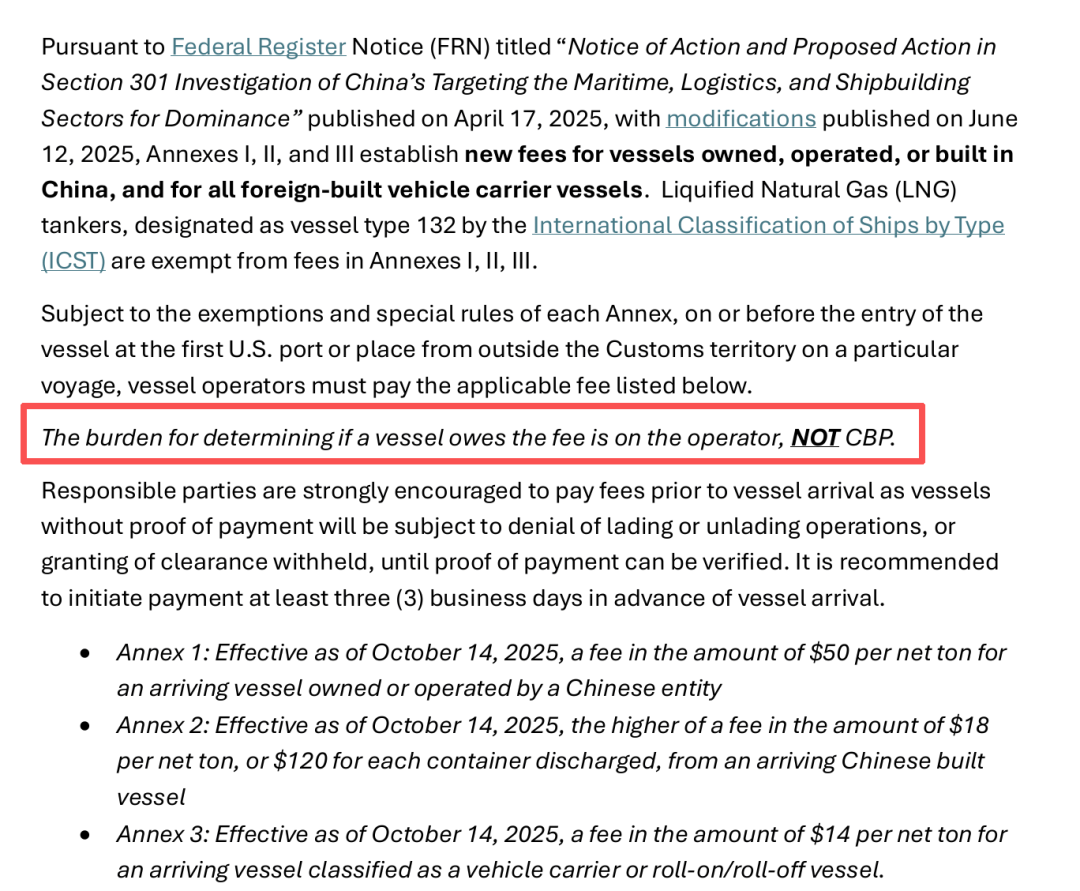 也就是说,美国政府把合规与缴费责任完全转嫁给船公司自己。换句话说:“船东和运营人要自己查明自己是否被归入‘中国拥有、运营或建造’范畴并缴纳费用,否则后果自负。”
