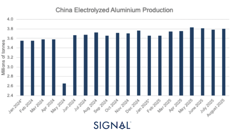 中国仍是全球铝土矿的最大买家,当月进口占全球总量的83%。中国铝产量在8月达到380万吨,同比增长2%,全年产量保持稳定。
