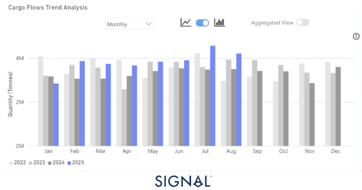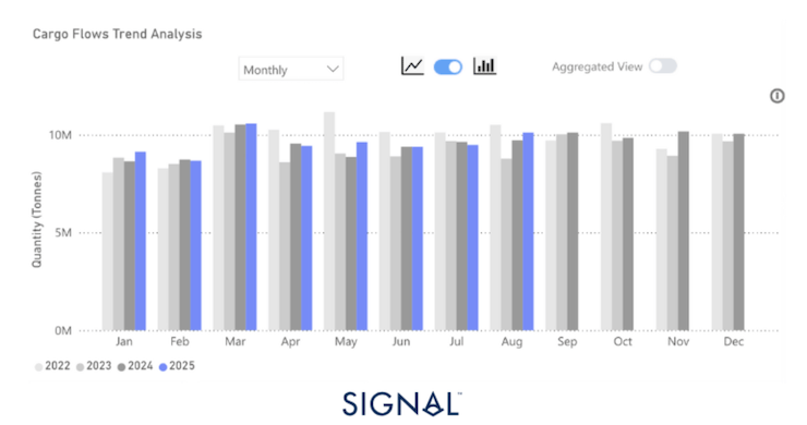 根据Signal Ocean的最新月度数据,全球小宗散货(minor bulk)出口量在2025年8月同比增长7%,延续了上半年以来的强劲势头。这一类别包括除铁矿石、煤炭和谷物外的干散货品种,如铝土矿、水泥、钢材、化肥、木材等。