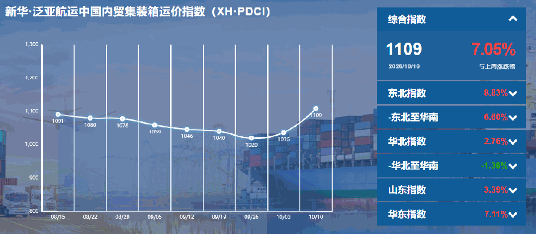 核心提示:本期(10月4日至10月10日)新华·泛亚航运中国内贸集装箱运价指数(XH·PDCI)报1109点,较上期(9月27日至10月3日)上涨73点,涨幅7.05%;同比上涨73点,涨幅3.70%;6只区域子指数全部上涨,4只流向指数三涨一跌。