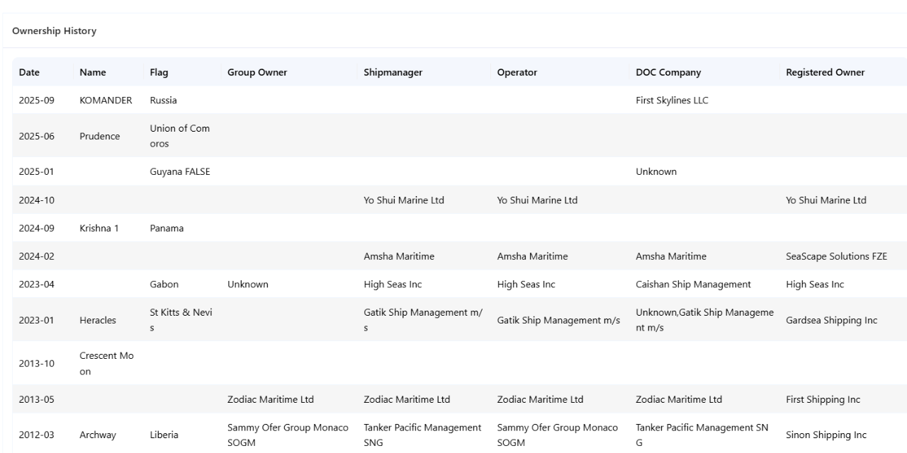 The ship has changed names and flags multiple times: it sailed as Krishna 1 (Panama flag) in 2024 and Prudence (Comoros flag) in early 2025 before being reflagged to Russia and renamed KOMANDER.