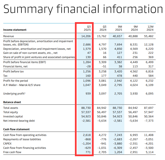 今天(11月6日),A.P. Moller - 马士基(马士基集团)发布2025年第三季度财报。得益于运营改善和积极的成本控制措施,本季度马士基业绩表现强劲,所有业务均实现了环比增长。基于此,马士基调整了2025年全年财务业绩指引。