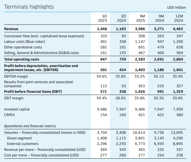 马士基的码头业务在第三季度延续强劲势头,吞吐量同比增长近9%,EBIT达到5.71亿美元,创下历史新高。