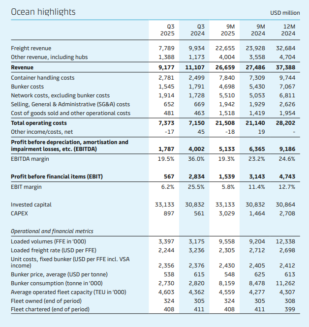 马士基在2025年第三季度交出了一份“环比增强、结构改善”的业绩答卷。虽然营收142亿美元较去年同期的高基数有所回落,但EBITDA达到26.86亿美元、EBIT达到12.84亿美元,显示经营质量进一步提升。海运业务Ocean、物流与服务、码头三大核心板块均实现环比改善,利润结构开始摆脱过去“过度依赖海运价差”阶段的波动特征,转向更加均衡且可持续的增长曲线。换言之,这并不是一份靠短期市场“行情”驱动的财报,而是一份由经营体系能力推动的财报。