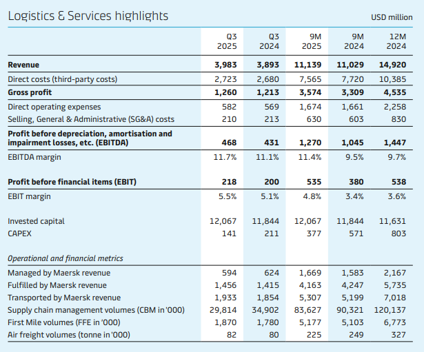 第三季度该板块利润率从上一季度的4.8%提升至5.5%,这一变化主要受益于“Fulfilled by Maersk”履约能力、尤其是仓储和供应链解决方案端的优化。这说明,在长期“端到端一体化物流”战略中,马士基正在从过去的“收购规模扩张”阶段,转向“深度整合 + 单位产能效率提升”阶段。利润改善更可持续,也更难被模仿。