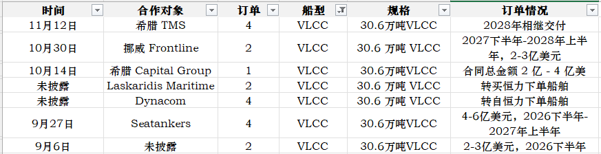 以最新订单以时间线,船舶类型等为坐标系,恒力2025年9-11月的详细订单显示,近两个月实际接单44艘,包括VLCC13艘,散货船24艘,以及集装箱7艘。