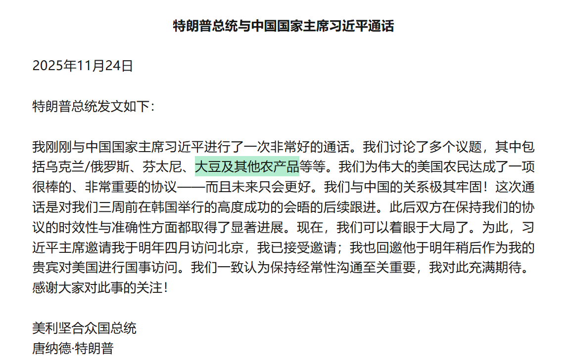 据路透社援引多名知情交易员消息,在美国总统特朗普与中国国家主席习近平于本周一通话之后,中国买家自周二以来已签署至少10船美国大豆采购合同,成交总额约3亿美元,装运期集中在1月。这批成交规模明显高于近期常规水平,被视为在中美贸易关系出现缓和后,中国对美国农产品采购加速的又一信号。