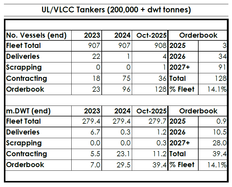 Scorpio的举动也是这一轮全球VLCC订单潮的重要组成部分。2025年已有多家头部船东或能源巨头下单,包括Frontline、Dynacom、Seatankers、TMS、Capital、Laskaridis、Eastmed,以及来自中远海运、中远海能的中国力量。在这一轮集中下单后,全球VLCC订单量已占现有船队规模的接近15%。