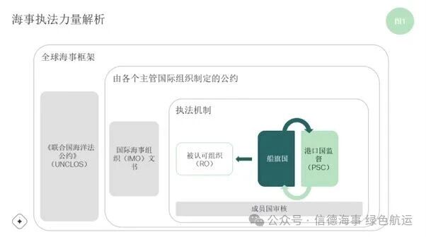 国际海事组织(International Maritime Organization, IMO)负责制定并通过与全球航运治理有关的法规,但并不负责监督其具体执行。各国主管部门承担着执行国际海事组织法规的职责,且通常会通过区域合作开展执法工作。