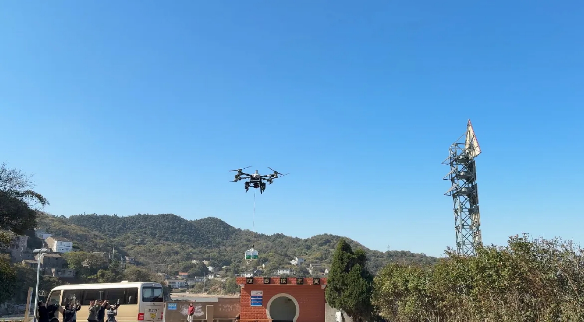 一架搭载38公斤淡水等物资的无人机从虾峙镇起飞,精准飞抵正在航行的“国电17”轮。此次任务突破传统物流模式,无人机通过智能感知系统与船舶保持同步航行,在动态飞行中通过索降系统完成物资投放,全程仅用时十分钟。与传统快艇配送需数小时相比,无人机以“空中直线”路径实现了效率的跨越式提升。