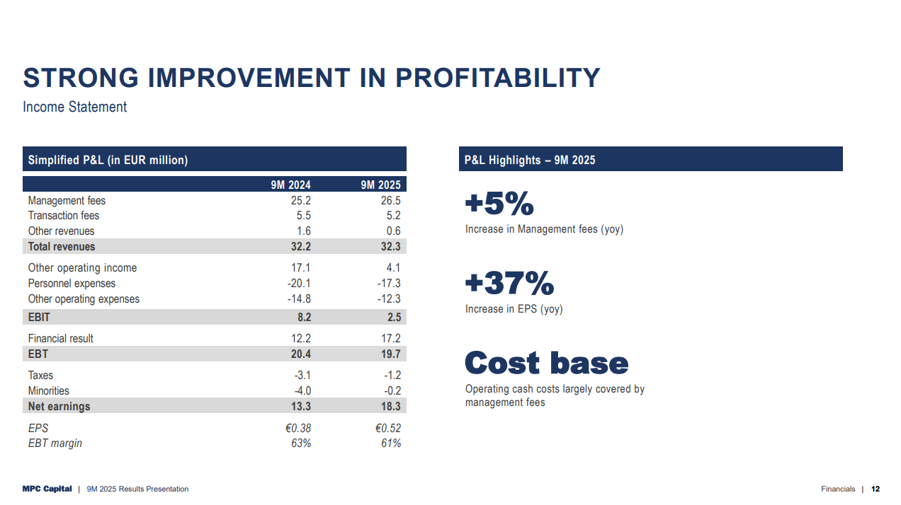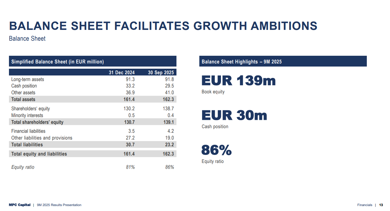 截至2025年9月底,MPC Capital的资产负债表保持良好状态,总资产达1.62亿欧元,现金储备接近3000万欧元。股权比率继续提升至86%,显著高于去年年底的81%,体现出公司极强的财务稳健性。