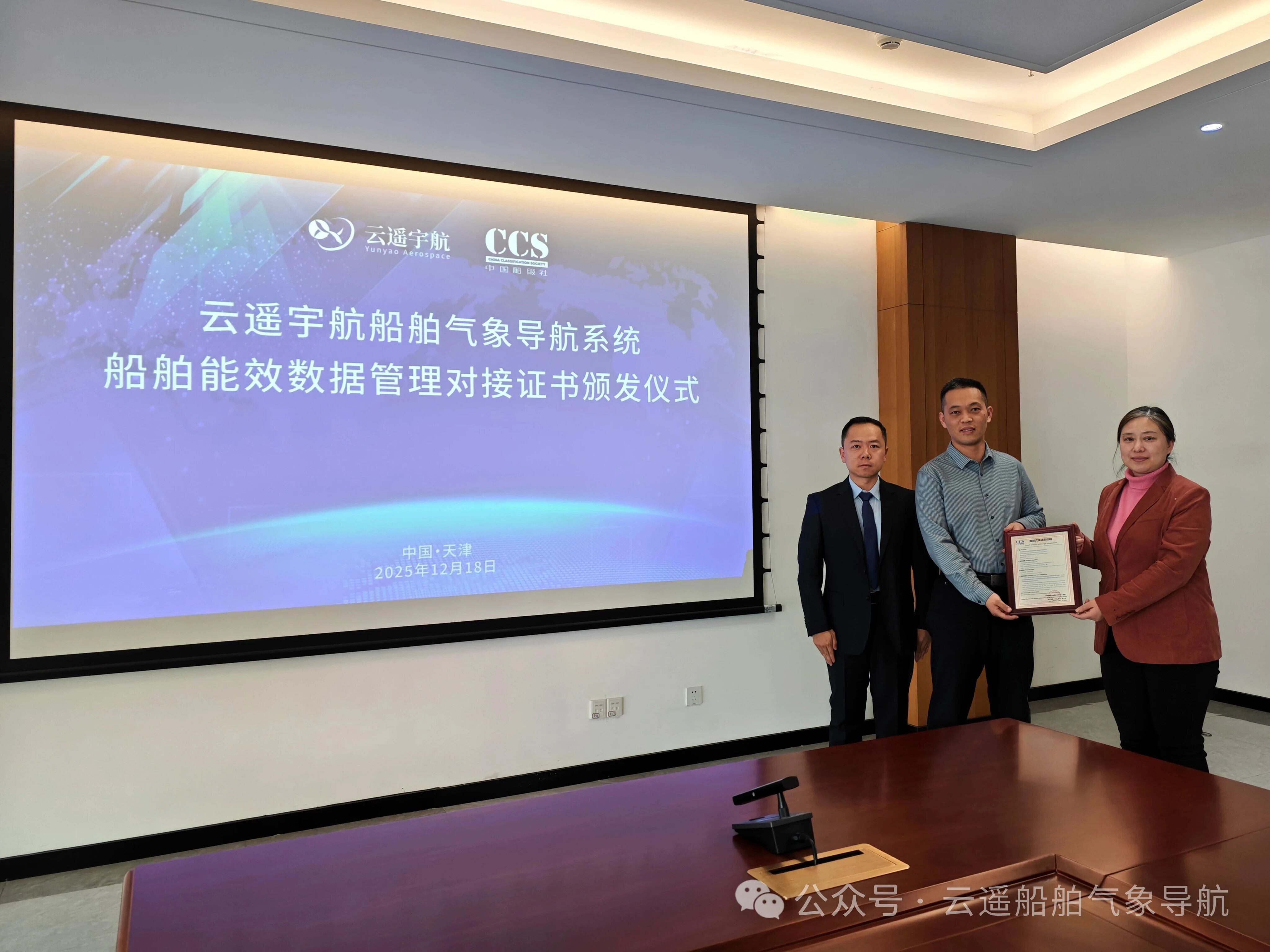 2025年12月18日,中国船级社(CCS)信息中心副主任杨丽、海脉互联科技有限公司总经理兰健一行到访调研云遥宇航天津总部,云遥宇航自主研发、联合海脉科技一起推进的船舶能效数据管理对接系统顺利通过中国船级社验收,云遥宇航同时获准加入船舶与海洋工程行业数据联盟(CSBC联盟),标志着商业气象卫星技术及数据与海事行业标准服务正式迈入深度融合的新阶段。